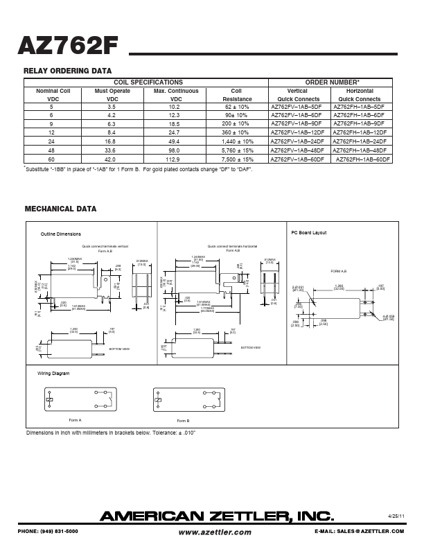 - Substitute “-1BB” in place of “-1AB” for 1 Form B. For gold plated contacts change “DF” to “DAF”