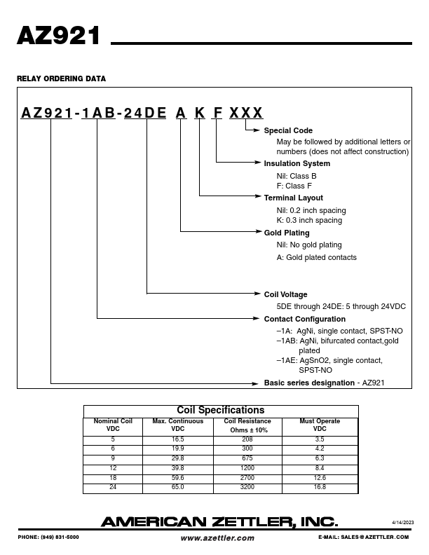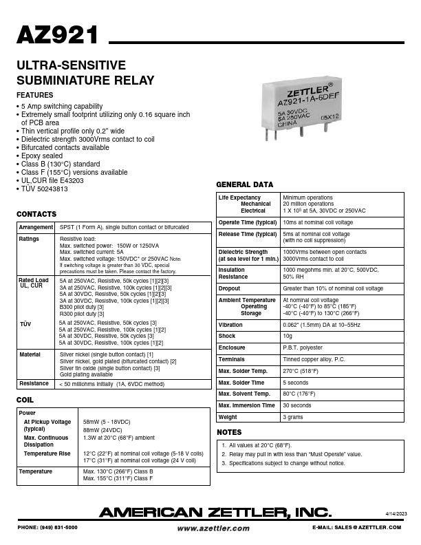 AZ921 ULTRA-SENSITIVE SUBMINIATURE RELAY.