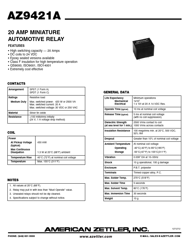 AZ9421A 20 AMP MINIATURE AUTOMOTIVE RELAY.