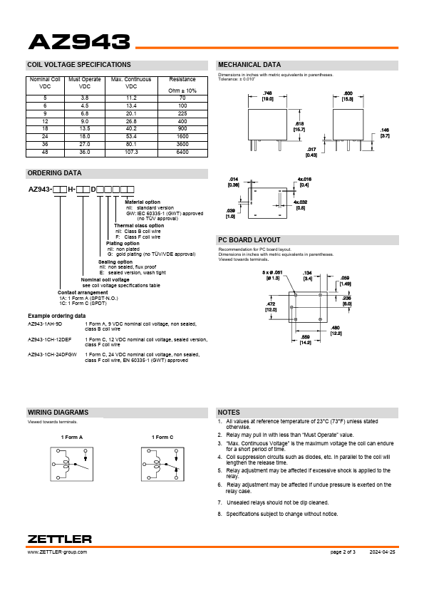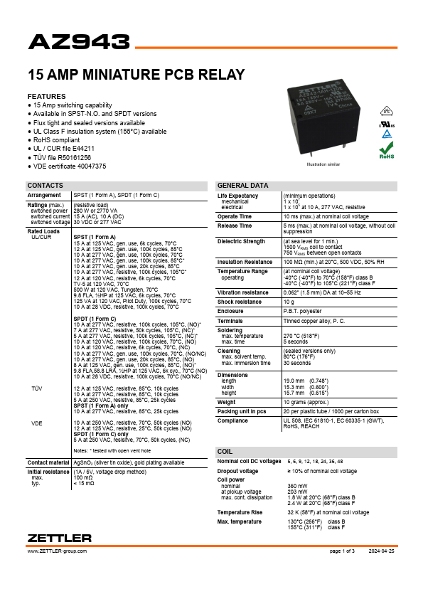 AZ943 15 AMP MINIATURE PCB RELAY.