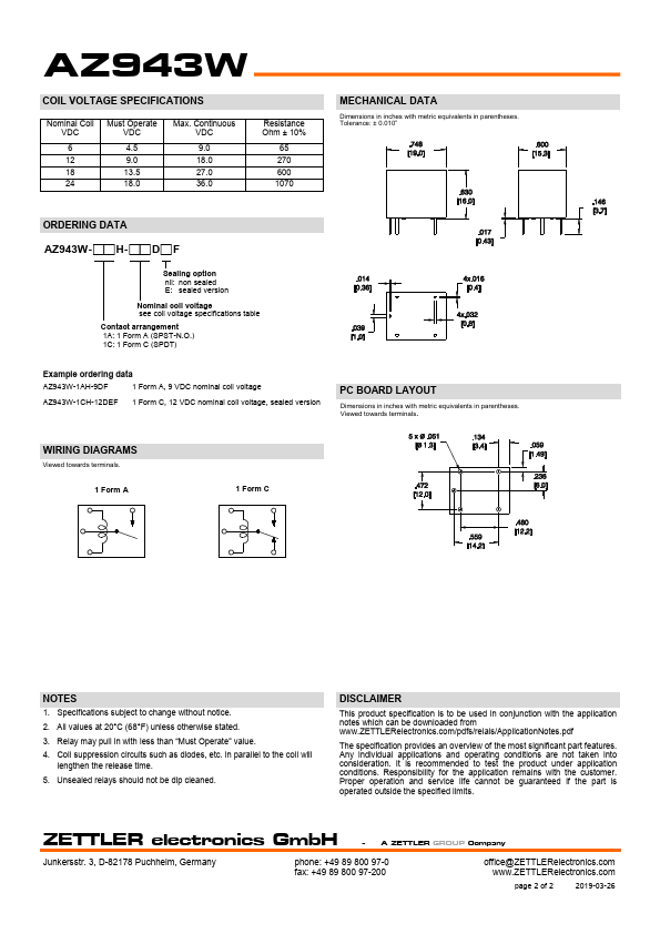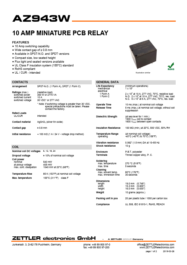 AZ943W 10 AMP MINIATURE PCB RELAY.