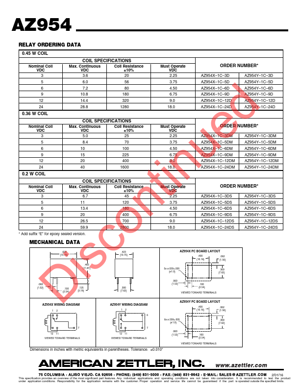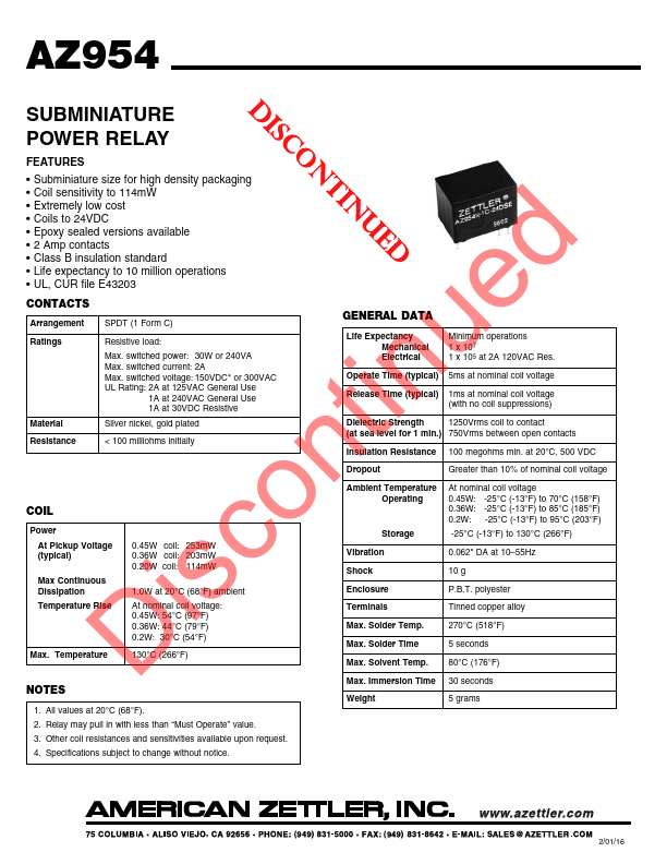 AZ954 Discontinued SUBMINIATURE POWER RELAY.