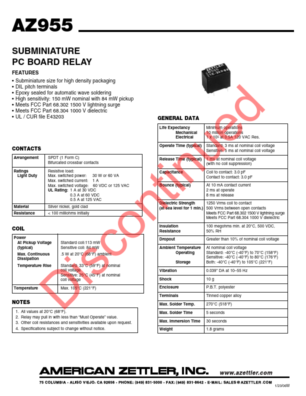 AZ955 SUBMINIATURE PC BOARD RELAY.