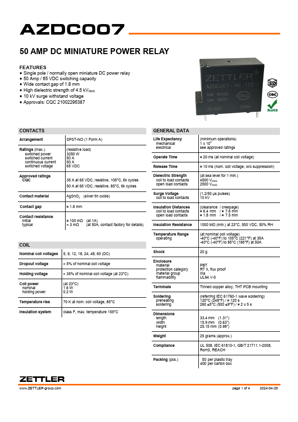 AZDC007 50 AMP DC MINIATURE POWER RELAY.