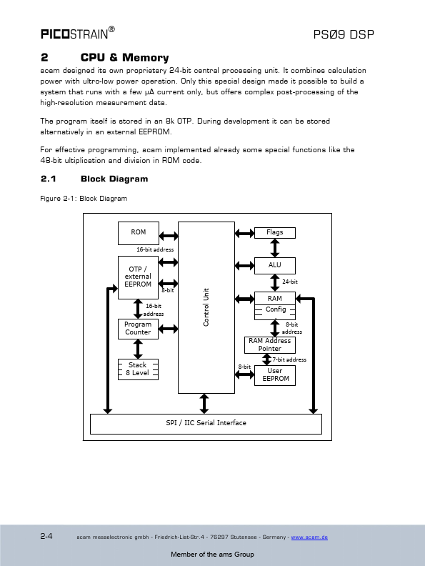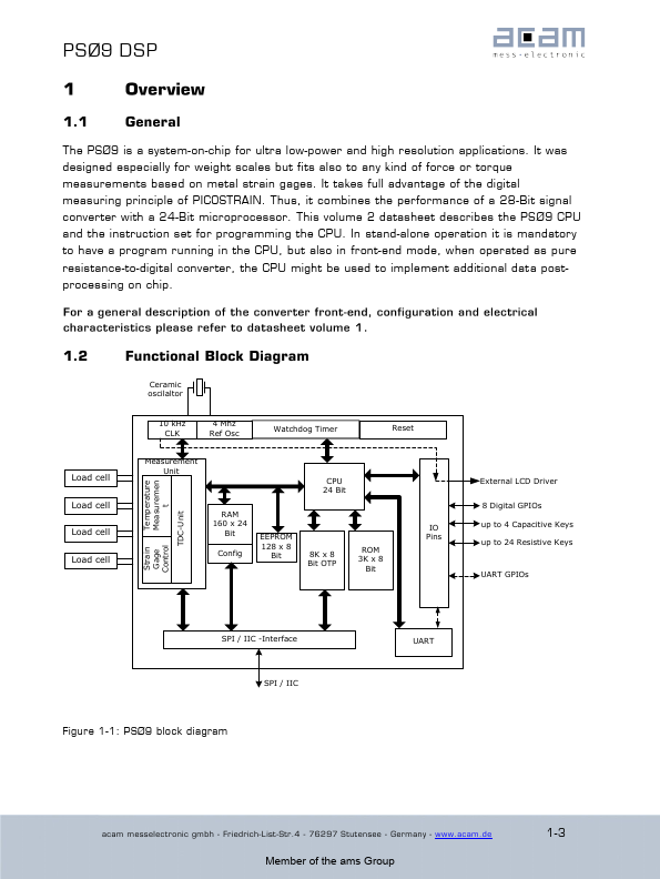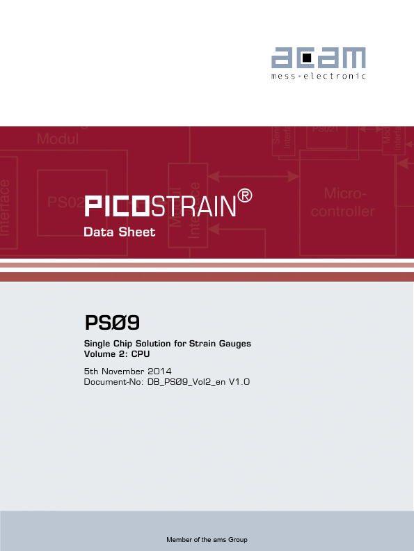 ® 5th November 2014 Document-No: DB_PSØ 9_Vol2_en V1.0 Member of the ams Group PSØ 9 DSP The PSØ 9 is a system-on-chip for ultra low-power and high resolution applications. It was designed especially for weight scales but fits also to any kind of force or torque measurements based on metal strain gages.