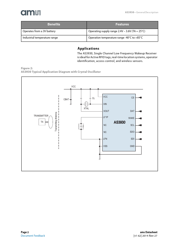 The AS3930 is a single-channel low power ASK receiver that is able to generate a wake-up upon detection of a data signal which uses a LF carrier frequency between 110 - 150 kHz.