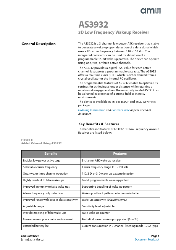 The AS3932 is a 3-channel low power ASK receiver that is able to generate a wake-up upon detection of a data signal which uses a LF carrier frequency between 110 - 150 kHz. The integrated correlator can be used for detection of a programmable 16-bit wake-up pattern. The device can operate using one, two, or three active channels.