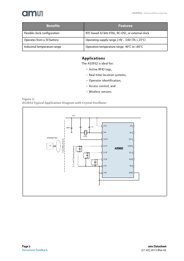 The AS3932 provides a digital RSSI value for each active channel, it supports a programmable data rate. The AS3932 offers a real-time clock (RTC), which is either derived from a crystal oscillator or the internal RC oscillator.