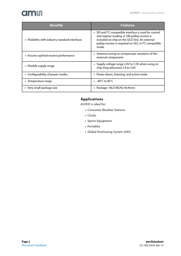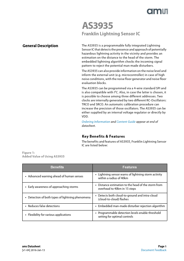 The AS3935 is a programmable fully integrated Lightning Sensor IC that detects the presence and approach of potentially hazardous lightning activity in the vicinity and provides an estimation on the distance to the head of the storm. The embedded lightning algorithm checks the incoming signal pattern to reject the potential man-made disturbers.