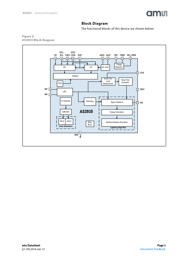 The AS3935 can also provide information on the noise level and inform the external unit (e.g. microcontroller) in case of high noise conditions, with the noise floor generator and noise floor evaluation blocks.
