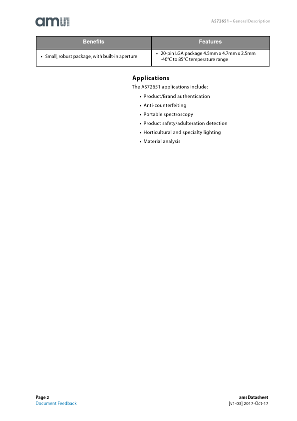 The AS72651 is a digital 6-channel multi-spectral sensor for spectral identification in the near IR light wavelengths, serving as master controller for the AS7265x chip-set.