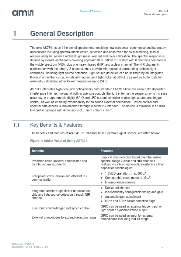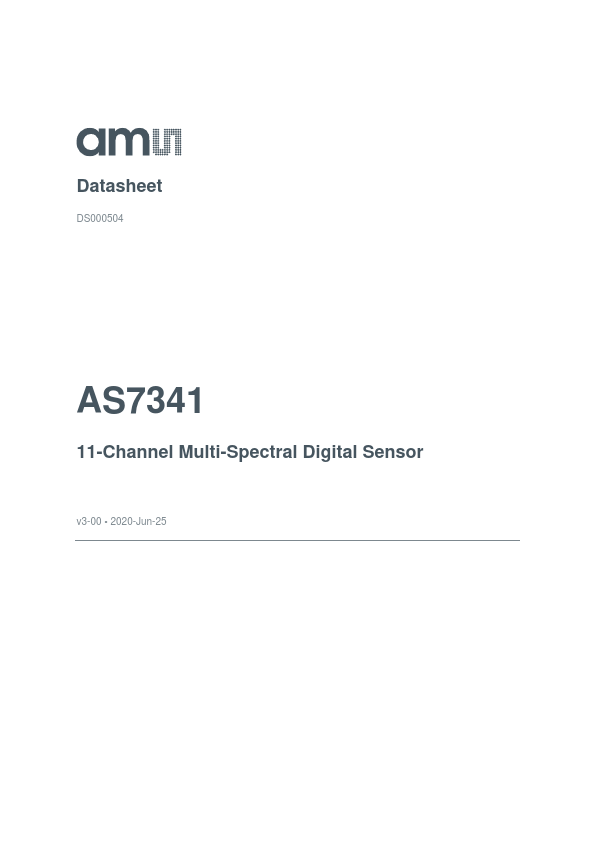 1 General Description The ams AS7341 is an 11-channel spectrometer enabling new consumer, mercial and laboratory applications including spectral identification, reflection and absorption for color matching, fluid or reagent analysis, passive ambient light measurement and color calibration. The spectral response is defined by individual channels covering approximately 350nm to 1000nm with 8 channels centered in the...