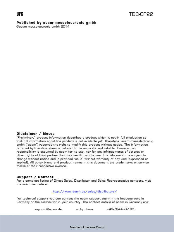 “Preliminary” product information describes a product which is not in full production so that full information about the product is not available yet. Therefore, acam-messelectronic gmbh (“acam”) reserves the right to modify this product without notice. The information provided by this data sheet is believed to be accurate and reliable.