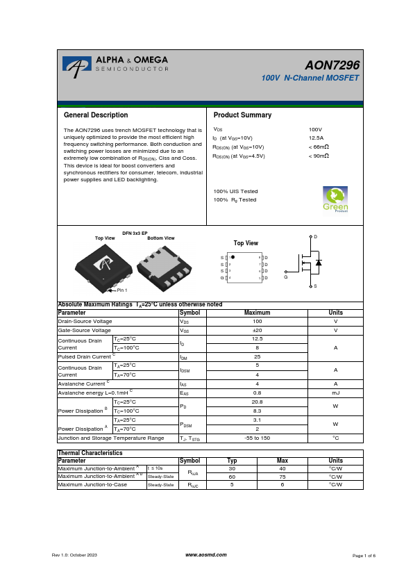The AON7296 uses trench MOSFET technology that is uniquely optimized to provide the most efficient high frequency switching performance. Both conduction and switching power losses are minimized due to an extremely low bination of RDS(ON), Ciss and Coss. This device is ideal for boost converters and synchronous rectifiers for consumer, tele, industrial power supplies and LED backlighting.