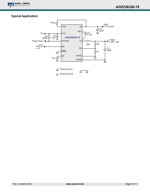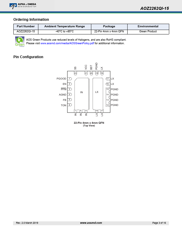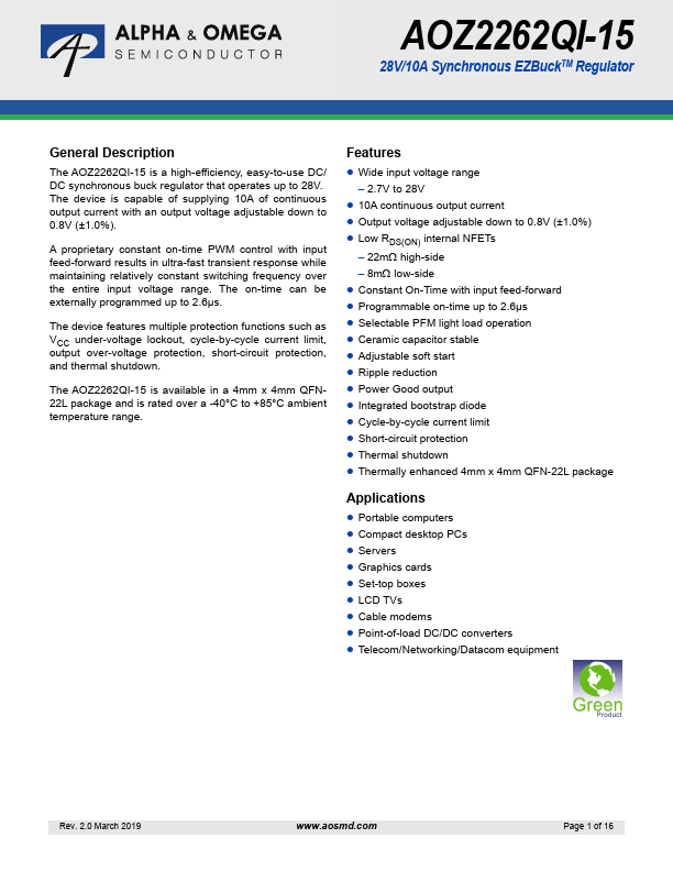 The AOZ2262QI-15 is a high-efficiency, easy-to-use DC/ DC synchronous buck regulator that operates up to 28V. The device is capable of supplying 10A of continuous output current with an output voltage adjustable down to 0.8V (±1.0%). A proprietary constant on-time PWM control with input feed-forward results in ultra-fast transient response while maintaining relatively constant switching frequency over the entire...