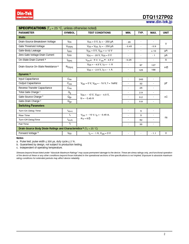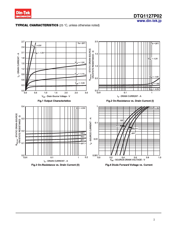 P-Channel 20 V (D-S) MOSFET DTQ1127P02 .din-tek.jp PRODUCT SUMMARY VDS (V) RDS(on) (mΩ )(Typ.) - 20 97 at VGS = - 4.5 V 125 at VGS = - 2.5 V ID (A)a - 2.5 Qg (Typ.) 3.