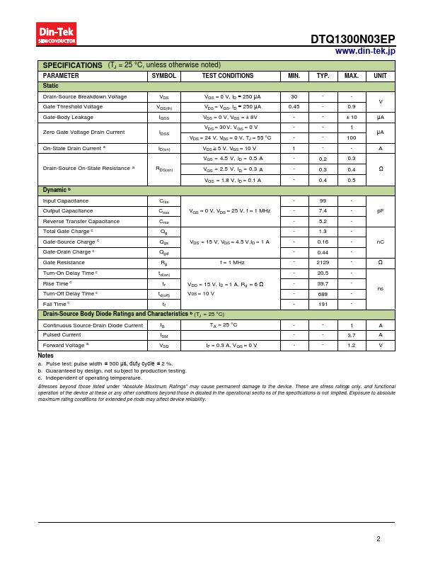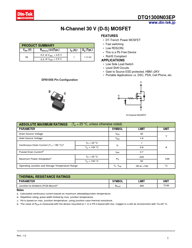 N-Channel 30 V (D-S) MOSFET DTQ1300N03EP .din-tek.jp PRODUCT SUMMARY VDS (V) RDS(on) (Ω )(Typ.) 30 0.2 at VGS = 4.5 V 0.3 at VGS = 2.5 V ID (A) a Qg (Typ.) 1 1.3 nC.