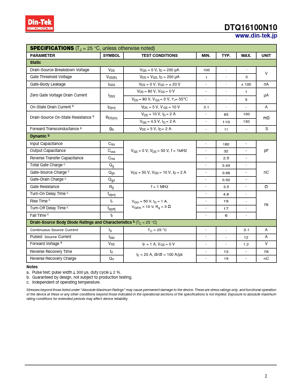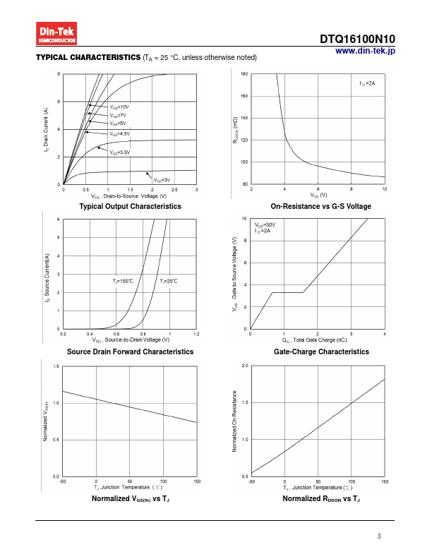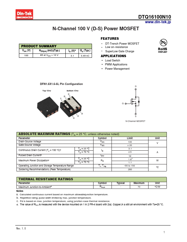 DTQ16100N10 .din-tek.jp N-Channel 100 V (D-S) Power MOSFET PRODUCT SUMMARY VDS (V) RDS(on) (mΩ )(Typ.) 100 85 at VGS = 10 V ID (A)a 3.1 Qg (Typ.) 3.49.