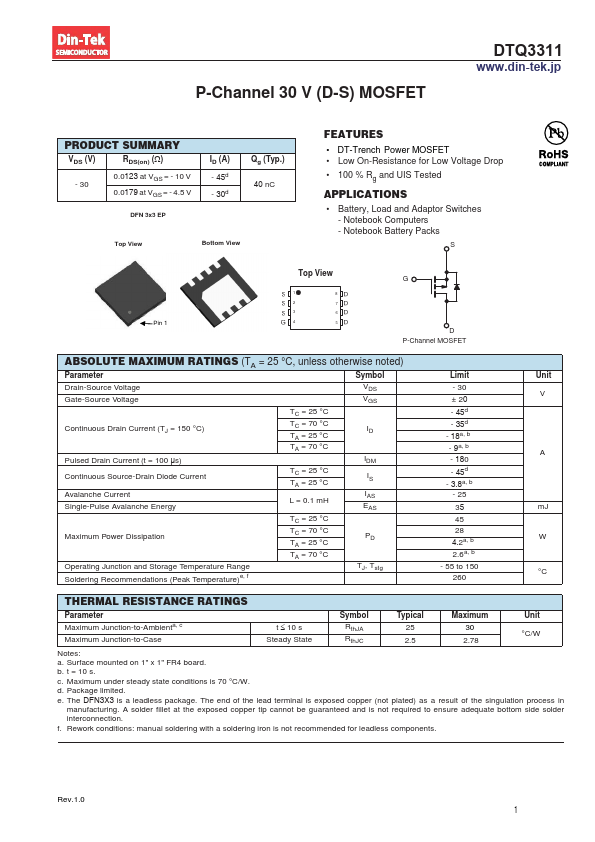 P-Channel 30 V (D-S) MOSFET '74 ZZZGLQWHNMS PRODUCT SUMMARY VDS (V) RDS(on) (:) 0.0 at VGS = - 10 V - 30 0.0 at VGS = - 4.5 V DFN 3x3 EP ID (A) -d -d Qg (Typ.) nC Top View Bottom View.