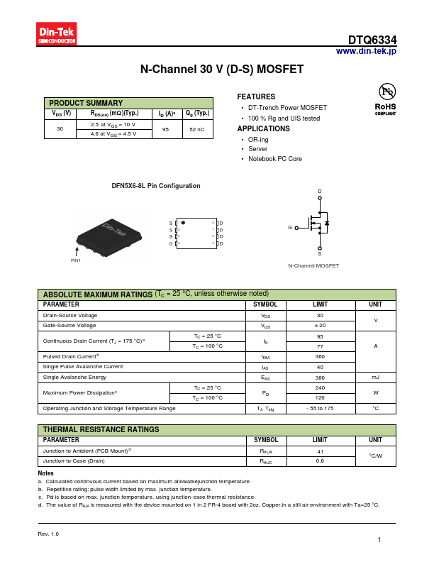 N-Channel 30 V (D-S) MOSFET DTQ6334 .din-tek.jp PRODUCT SUMMARY VDS (V) RDS(on) (mΩ )(Typ.) 30 2.5 at VGS = 10 V 4.6 at VGS = 4.5 V ID (A)a Qg (Typ.) 95 52.