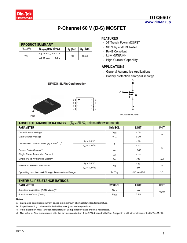P-Channel 60 V (D-S) MOSFET DTQ6607 .din-tek.jp PRODUCT SUMMARY VDS (V) RDS(on) (mΩ )(Typ.) - 60 7.5 at VGS = - 10 V 9.5 at VGS = - 4.5 V ID (A) a Qg (Typ.) - 90 78 nC.