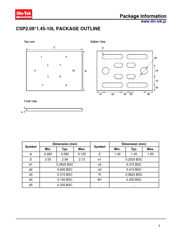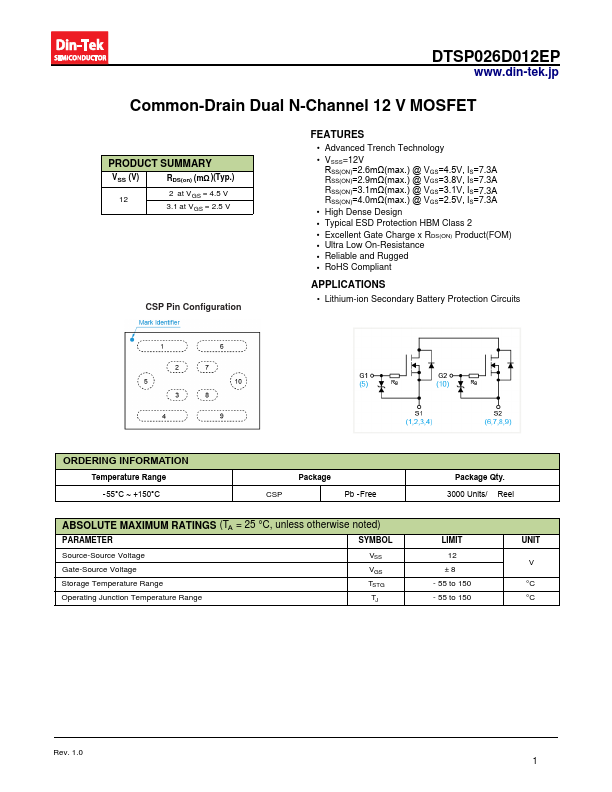 DTSP026D012EP .din-tek.jp mon-Drain Dual N-Channel 12 V MOSFET PRODUCT SUMMARY VSS (V) RDS(on) (mΩ )(Typ.) 12 2 at VGS = 4.5 V 3.1 at VGS = 2.5 V CSP.