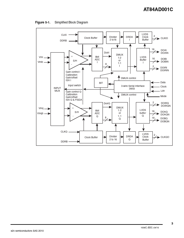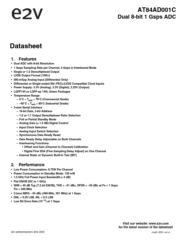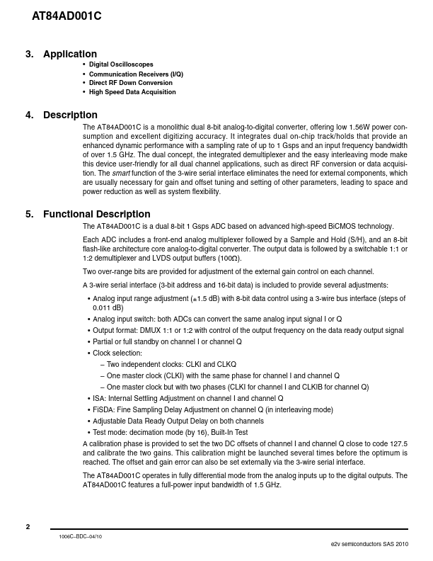 The AT84AD001C is a monolithic dual 8-bit analog-to-digital converter, offering low 1.56W power consumption and excellent digitizing accuracy. It integrates dual on-chip track/holds that provide an enhanced dynamic performance with a sampling rate of up to 1 Gsps and an input frequency bandwidth of over 1.5 GHz. The dual concept, the integrated demultiplexer and the easy interleaving mode make this device...