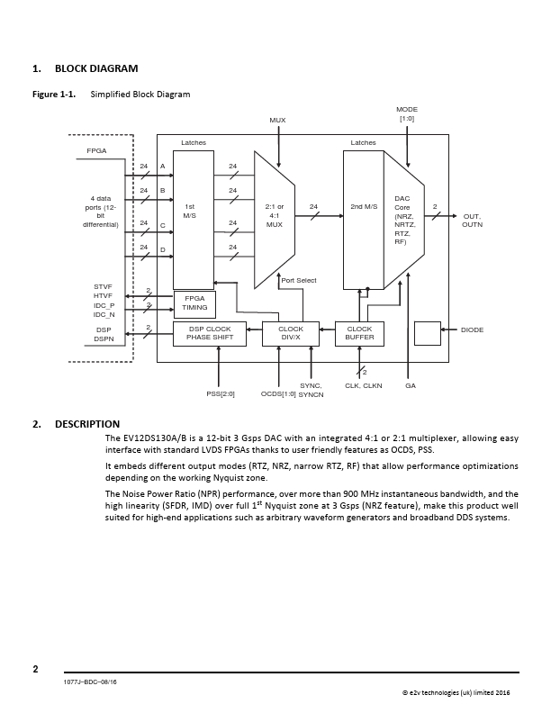 ” on page 15) Performances Characterized for Fout from 100 MHz to 4500 MHz and from 2 Gsps to 3.2 Gsps Performance Industrially Screened Over 3 Nyquist Zones at 3 Gsps for Selected Fout. Step Response Full Scale Rise /Fall Time 50 ps Applications Direct Digital Synthesis for Broadband Applications (L‐S and Lower C Band) Automatic Test Equipment (ATE) Arbitrary Waveform Generators Radar Waveform Signal Synthesis...