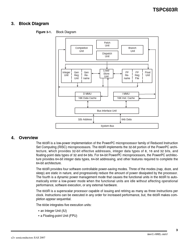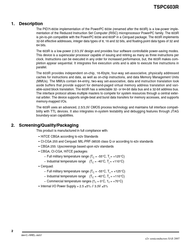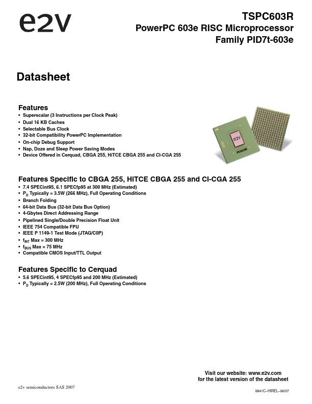 The PID7t-603e implementation of the PowerPC 603e (renamed after the 603R) is a low-power implementation of the Reduced Instruction Set puter (RISC) microprocessor PowerPC family. The 603R is pin-to-pin patible with the PowerPC 603e and 603P in a Cerquad package. The 603R implements 32-bit effective addresses, integer data types of 8, 16 and 32 bits, and floating-point data types of 32 and 64 bits.