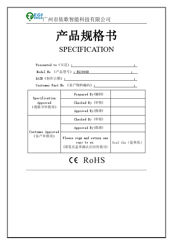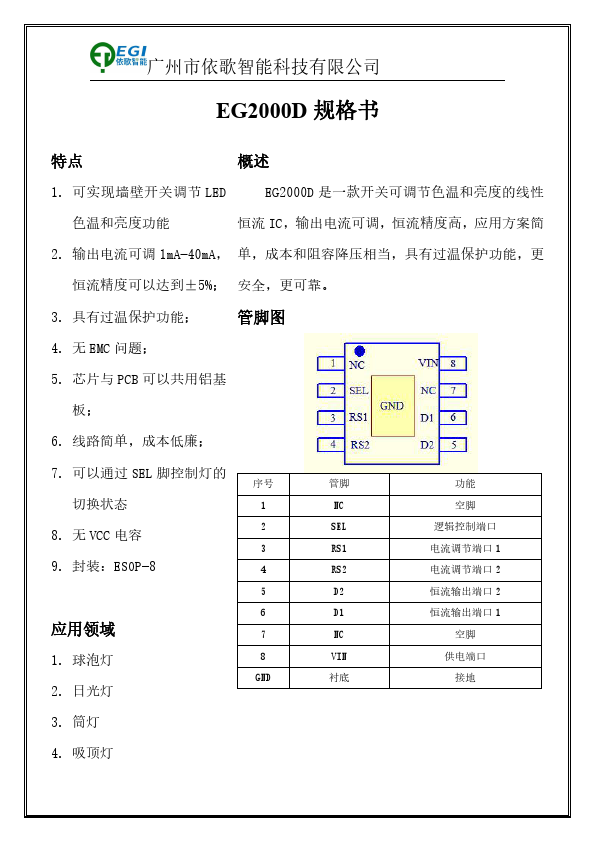 广州市依歌智能科技有限公司 产品规格书 SPECIFICATION Presented to(呈送): ; Model No.(产品型号):EG2000D ; DATE(制作日期): ; Customer Part No.(客户物料编码): ; Specification Approved (规格书审批项) Prepared By(编制) Checked By (审核) Approved By(批准) Checked By (审核) Customer Approved (客户审批项) Approved By(批准) Please sign and return one copy to us. (请签名盖章确认后回传我司) Seal the(盖章处) 广州市依歌智能科技有限公司 EG2000D 规格书 特点 概述 1. 可实现墙壁开关调节 LED EG2000D 是一款开关可调节色温和亮度的线性 色温和亮度功能 恒流...