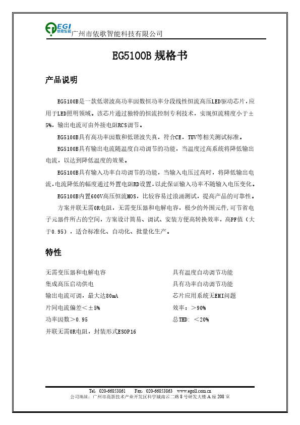 | EG5200A | low-harmonic high-power factor constant-power segmented linear constant-current high-voltage LED driver |