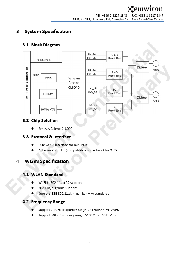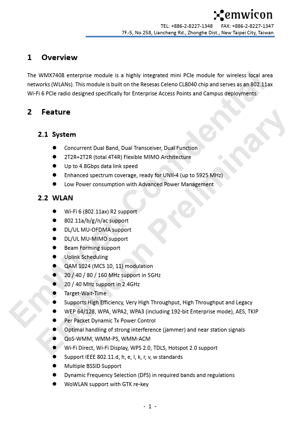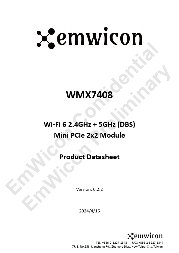 fidenitniaalry WMX7408 on lim Wi-Fi 6 2.4GHz + 5GHz (DBS) C re Mini PCIe 2x2 Module icon n P Product Datasheet mW WicoVersion: 0.2.2 E Em 2024/4/16 TEL: +886-2-8227-1347 7F.-5, No.258, Liancheng Rd., Zhonghe Dist., New Taipei City, Taiwan TEL:.