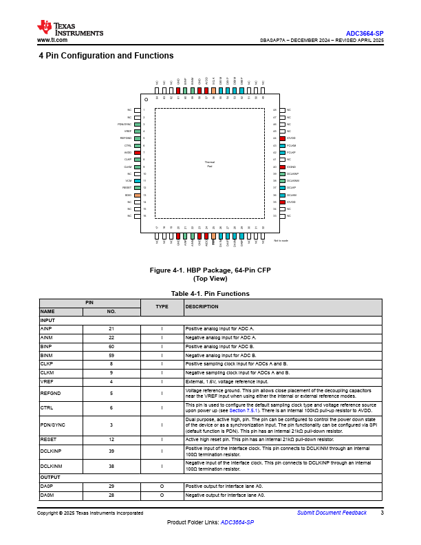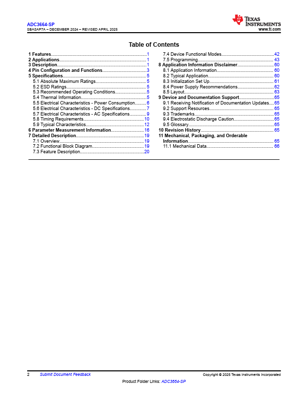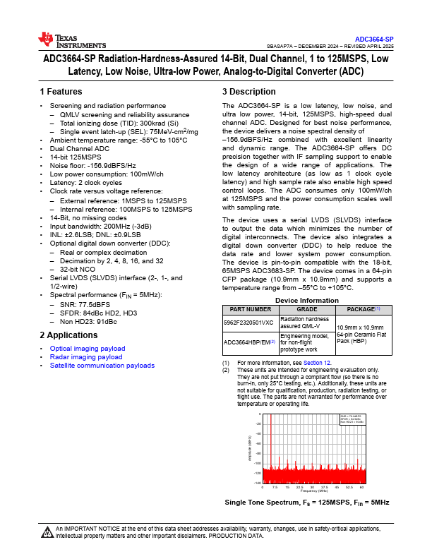 Overview: ADC3664-SP SBASAP7A – DECEMBER 2024 – REVISED APRIL 2025 ADC3664-SP Radiation-Hardness-Assured 14-Bit, Dual Channel, 1 to 125MSPS, Low Latency, Low Noise, Ultra-low Power, Analog-to-Digital Converter (ADC).