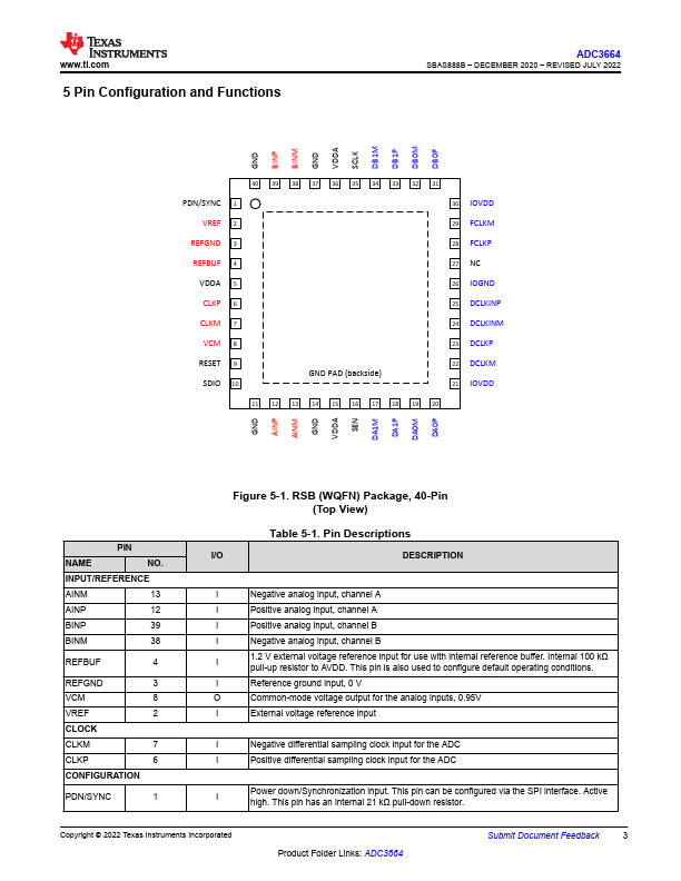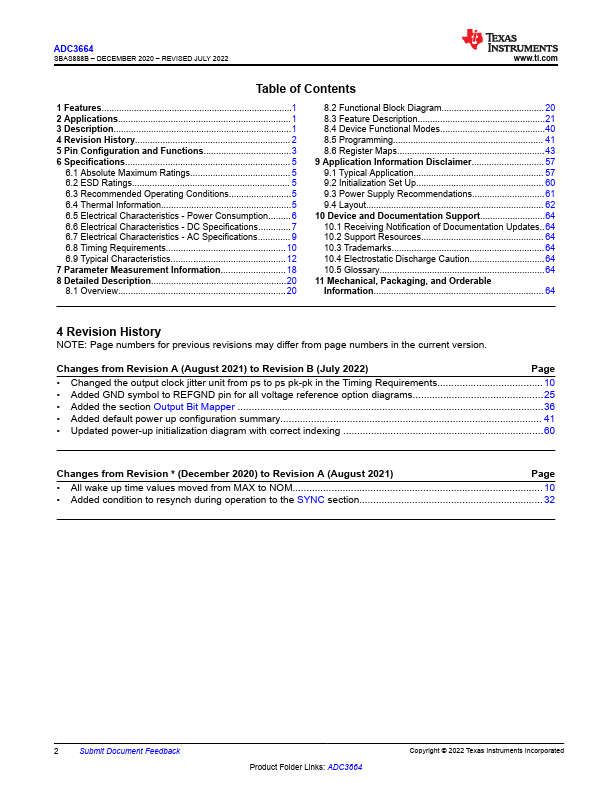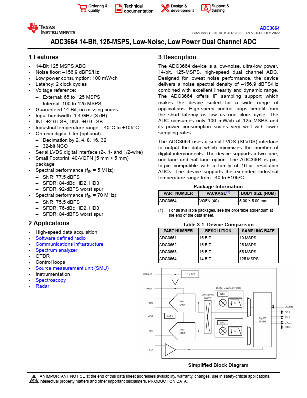 Overview: ADC3664 SBAS888B – DECEMBER 2020 – REVISED JULY 2022 ADC3664 14-Bit, 125-MSPS, Low-Noise, Low Power Dual Channel ADC.