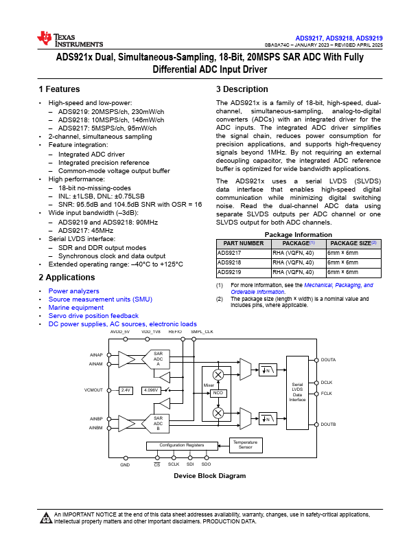 ADS9219 is 18-Bit 20MSPS SAR ADC manufactured by Texas Instruments.