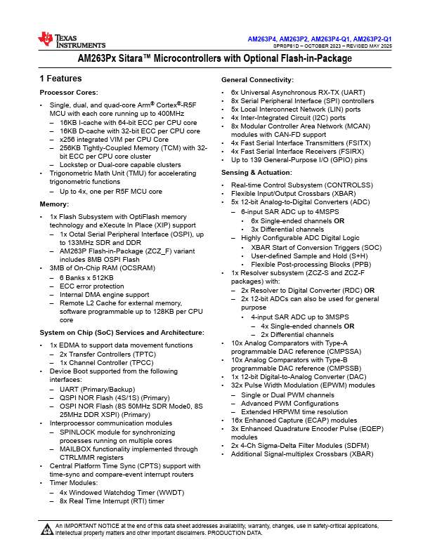 AM263P4, AM263P2, AM263P4-Q1, AM263P2-Q1 SPRSP81D - OCTOBER 2023 - REVISED MAY 2025 AM263Px Sitara™ Microcontrollers with Optional Flash-in-Package 1 Features Processor Cores: - Single, dual, and quad-core Arm® Cortex®-R5F MCU with each core running up to 400MHz - 16KB I-cache with 64-bit ECC per CPU core - 16KB D-cache with 32-bit ECC per CPU core - x256 integrated VIM per CPU Core - 256KB Tightly-Coupled Memory (TCM) with 32bit ECC per CPU core cluster - Lockstep or Dual-core capable clusters - Trigonometric Math Unit (TMU) for accelerating trigonometric functions - Up to 4x, one per R5F MCU core Memory: - 1x Flash Subsystem with OptiFlash memory technology and eXecute In Place (XIP)...