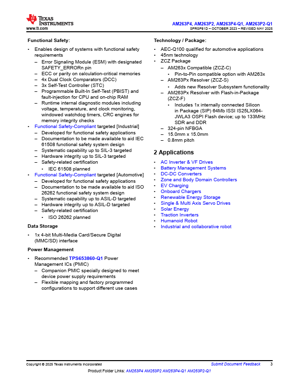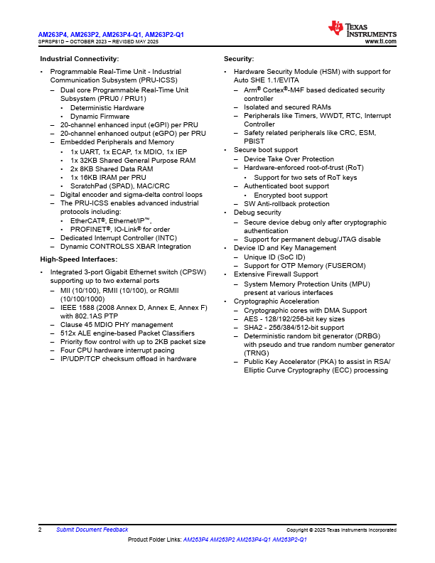 AM263P4, AM263P2, AM263P4-Q1, AM263P2-Q1 SPRSP81D - OCTOBER 2023 - REVISED MAY 2025 AM263Px Sitara™ Microcontrollers with Optional Flash-in-Package 1 Features Processor Cores: - Single, dual, and quad-core Arm® Cortex®-R5F MCU with each core running up to 400MHz - 16KB I-cache with 64-bit ECC per CPU core - 16KB D-cache with 32-bit ECC per CPU core - x256 integrated VIM per CPU Core - 256KB Tightly-Coupled Memory (TCM) with 32bit ECC per CPU core cluster - Lockstep or Dual-core capable clusters - Trigonometric Math Unit (TMU) for accelerating trigonometric functions - Up to 4x, one per R5F MCU core Memory: - 1x Flash Subsystem with OptiFlash memory technology and eXecute In Place (XIP)...