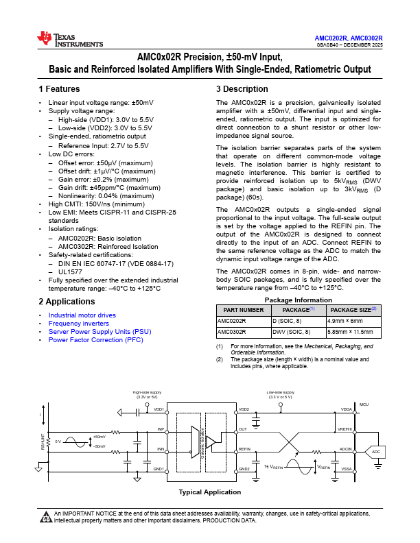 The AMC0x02R is a precision, galvanically isolated amplifier with a ±50mV, differential input and singleended, ratiometric output. The input is optimized for direct connection to a shunt resistor or other lowimpedance signal source. The isolation barrier separates parts of the system that operate on different mon-mode voltage levels.