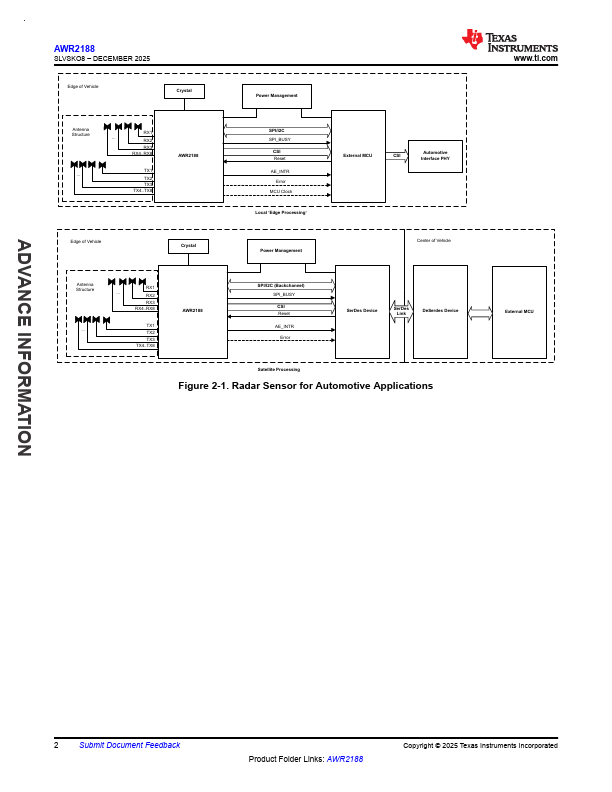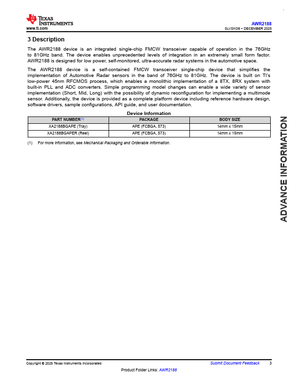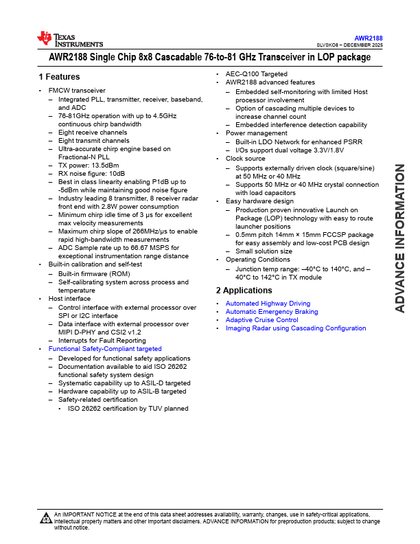 ADVANCE INFORMATION AWR2188 SLVSKO8 DECEMBER 2025 AWR2188 Single Chip 8x8 Cascadable 76-to-81 GHz Transceiver in LOP package.