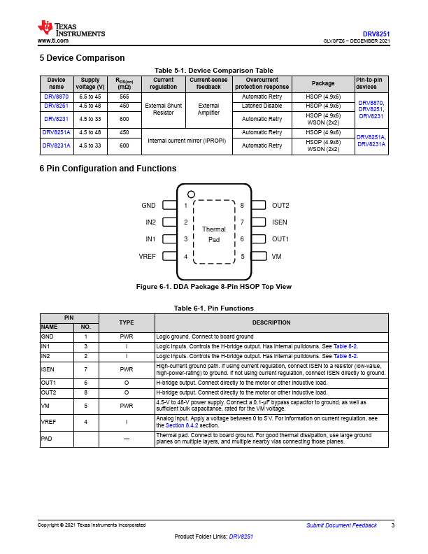 The DRV8251 device is an integrated motor driver with N-channel H-bridge, charge pump, current regulation, and protection circuitry.