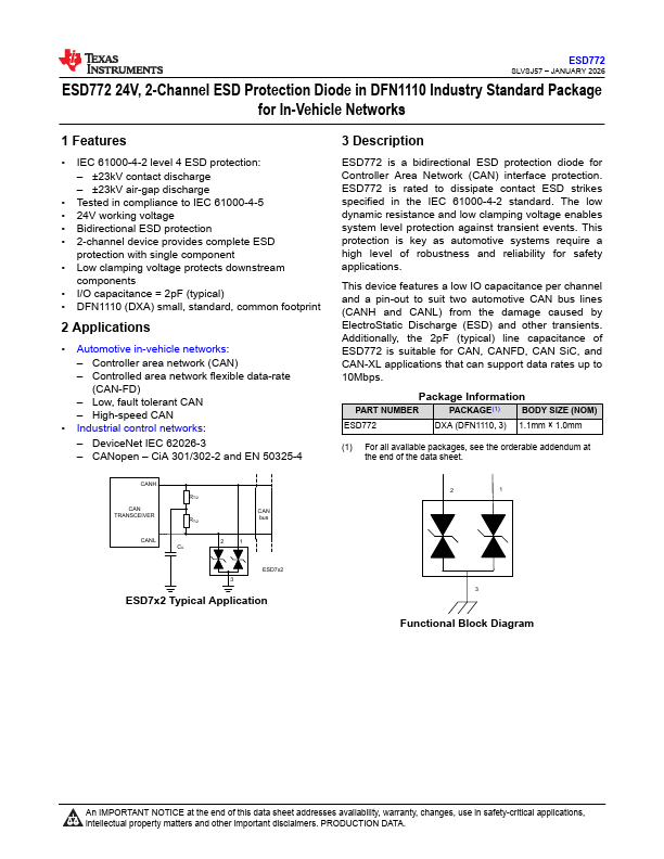 ESD772 is a bidirectional ESD protection diode for Controller Area Network (CAN) interface protection. ESD772 is rated to dissipate contact ESD strikes specified in the IEC 61000-4-2 standard. The low dynamic resistance and low clamping voltage enables system level protection against transient events.