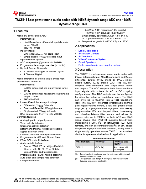 TAC5111 is Low-power mono audio codec manufactured by Texas Instruments.