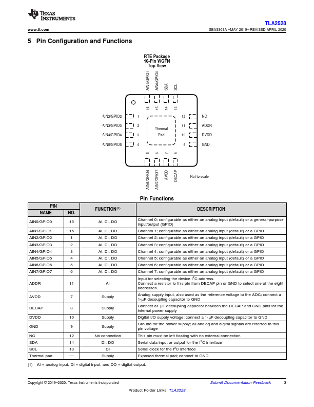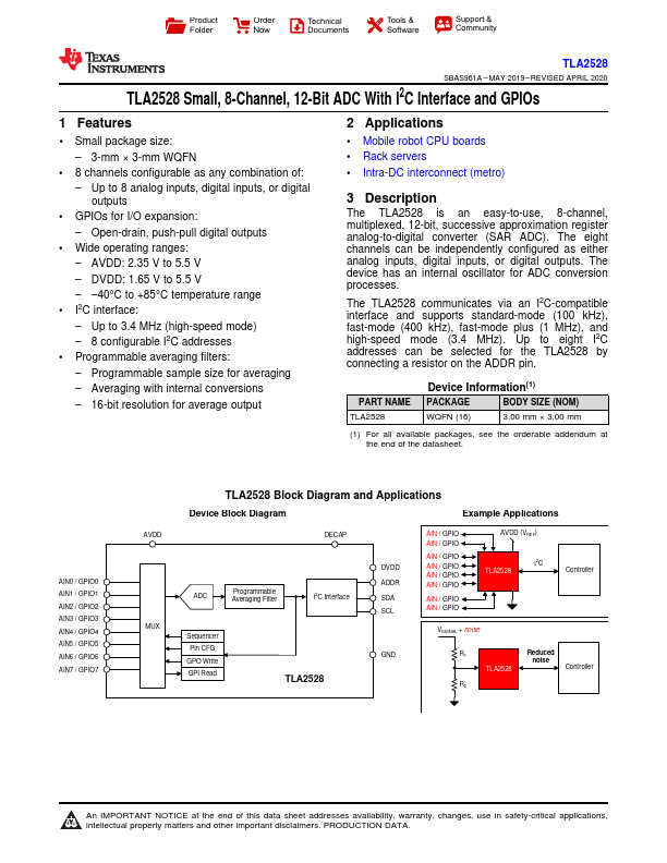 The TLA2528 is an easy-to-use, 8-channel, multiplexed, 12-bit, successive approximation register analog-to-digital converter (SAR ADC). The eight channels can be independently configured as either analog inputs, digital inputs, or digital outputs. The device has an internal oscillator for ADC conversion processes.
