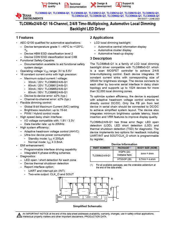 TLC69602-Q1, TLC69604-Q1, TLC69608-Q1, TLC69612-Q1, TLC69614-Q1, TLC69618-Q1, TLC69652-Q1, TLC69654-Q1, TLC69658-Q1, TLC69662-Q1, TLC69664-Q1, TLC69668-Q1 SNVSCK7 - JUNE 2023 TLC696x2/4/8-Q1 16-Channel, 2/4/8 Time-Multiplexing, Automotive Local Dimming Backlight LED Driver 1 Features - AEC-Q100 qualified for automotive applications: - Device temperature grade 1: - 40°C to +125°C, TA - Device HBM ESD classification level 2 - Device CDM ESD classification level C4B - Functional Safety-Capable: - Documentation available to aid functional safety system design - Operating voltage VCC range: 3V to 5.5V - 16 constant current sinks with high precision: - Maximum output current / voltage: - 30mA /...