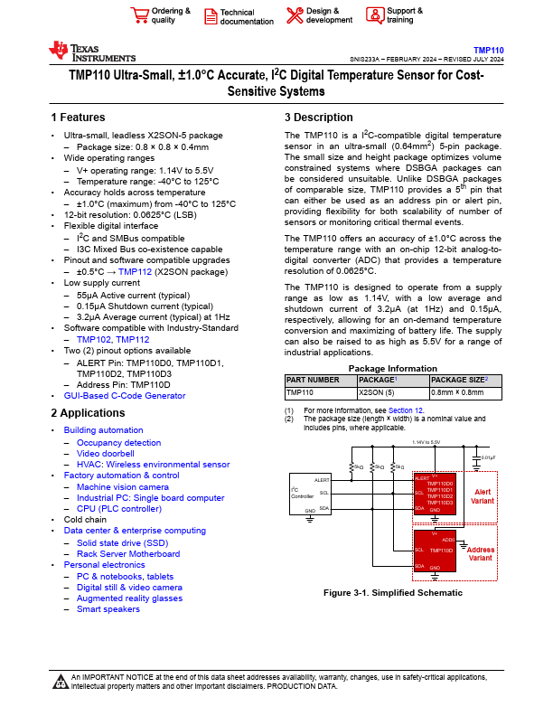 TMP110 Ultra-Small, ±1.0°C Accurate, I2C Digital Temperature Sensor for CostSensitive Systems