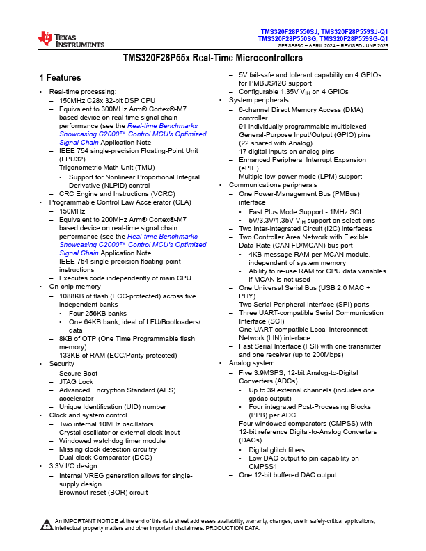 TMS320F28P550SJ, TMS320F28P559SJ-Q1 TMS320F28P550SG, TMS320F28P559SG-Q1 SPRSP85C - APRIL 2024 - REVISED JUNE 2025 TMS320F28P55x Real-Time Microcontrollers 1 Features - Real-time processing: - 150MHz C28x 32-bit DSP CPU - Equivalent to 300MHz Arm® Cortex®-M7 based device on real-time signal chain performance (see the Real-time Benchmarks Showcasing C2000™ Control MCU's Optimized Signal Chain Application Note - IEEE 754 single-precision Floating-Point Unit (FPU32) - Trigonometric Math Unit (TMU) - Support for Nonlinear Proportional Integral Derivative (NLPID) control - CRC Engine and Instructions (VCRC) - Programmable Control Law Accelerator (CLA) - 150MHz - Equivalent to 200MHz Arm®...