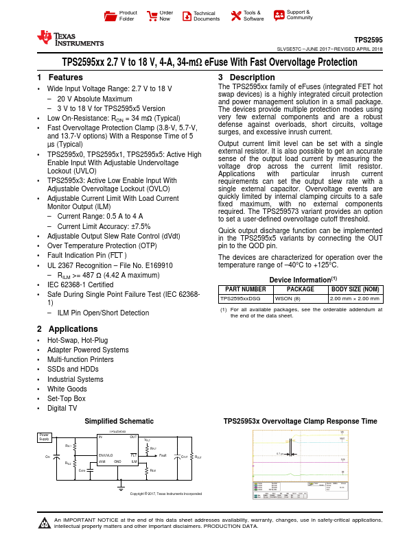Product Folder Order Now Technical Documents Tools & Software Support & munity TPS2595 SLVSE57C - JUNE 2017 - REVISED APRIL 2018 TPS2595xx 2.7 V to 18 V, 4-A, 34-mΩ eFuse With Fast Overvoltage Protection 1 Features - 1 Wide Input Voltage Range: 2.7 V to 18 V - 20 V Absolute Maximum - 3 V to 18 V for TPS2595x5 Version - Low On-Resistance: RON = 34 mΩ (Typical) - Fast Overvoltage Protection Clamp (3.8-V, 5.7-V, and 13.7-V options) With a Response Time of 5 µs (Typical) - TPS2595x0, TPS2595x1, TPS2595x5: Active High Enable Input With Adjustable Undervoltage Lockout (UVLO) - TPS2595x3: Active Low Enable Input With Adjustable Overvoltage Lockout (OVLO) - Adjustable Current Limit With...