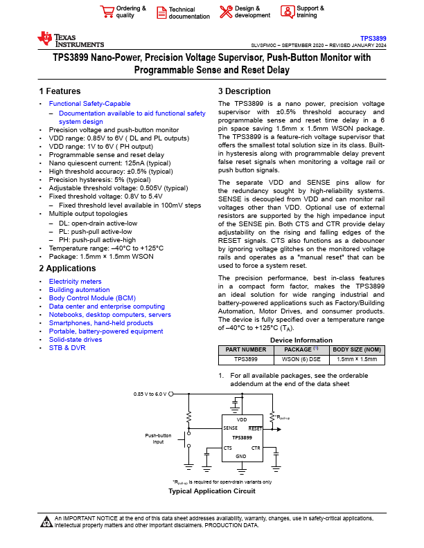 TPS3899 Nano-Power, Precision Voltage Supervisor, Push-Button Monitor with Programmable Sense and Reset Delay