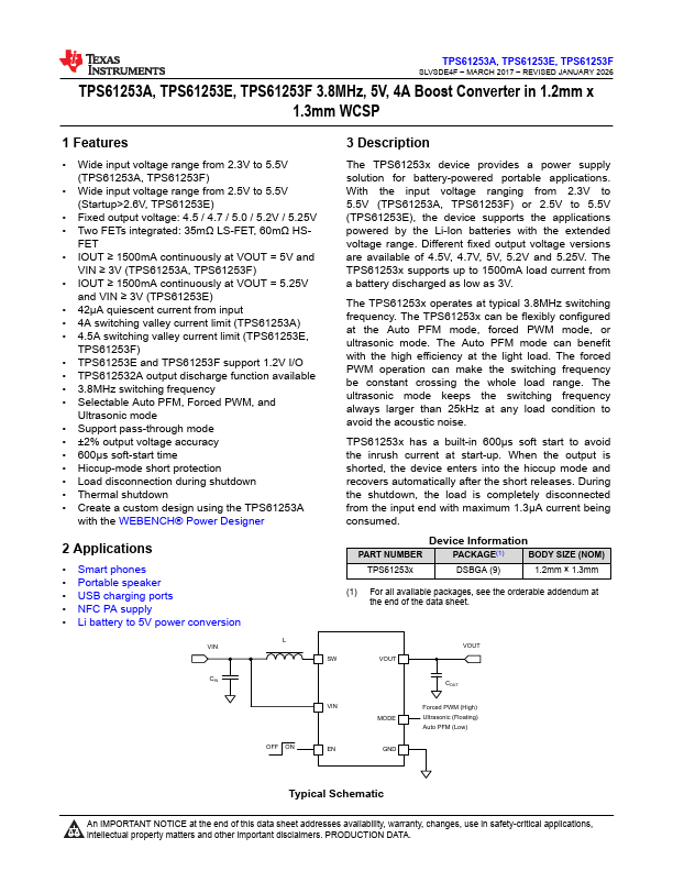 - Wide input voltage range from 2.3V to 5.5V (TPS61253A, TPS61253F)