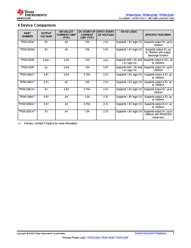 Wide input voltage range from 2.3V to 5.5V (TPS61253A, TPS61253F) Wide input voltage range from 2.5V to 5.5V (Startup>2.6V, TPS61253E) Fixed output voltage: 4.5 / 4.7 / 5.0 / 5.2V / 5.25V Two FETs integrated: With the input voltage ranging from 2.3V to 5.5V (TPS61253A, TPS61253F) or 2.5V to 5.5V (TPS61253E), the device supports the applications powered by the Li-Ion batteries with the extended voltage range.